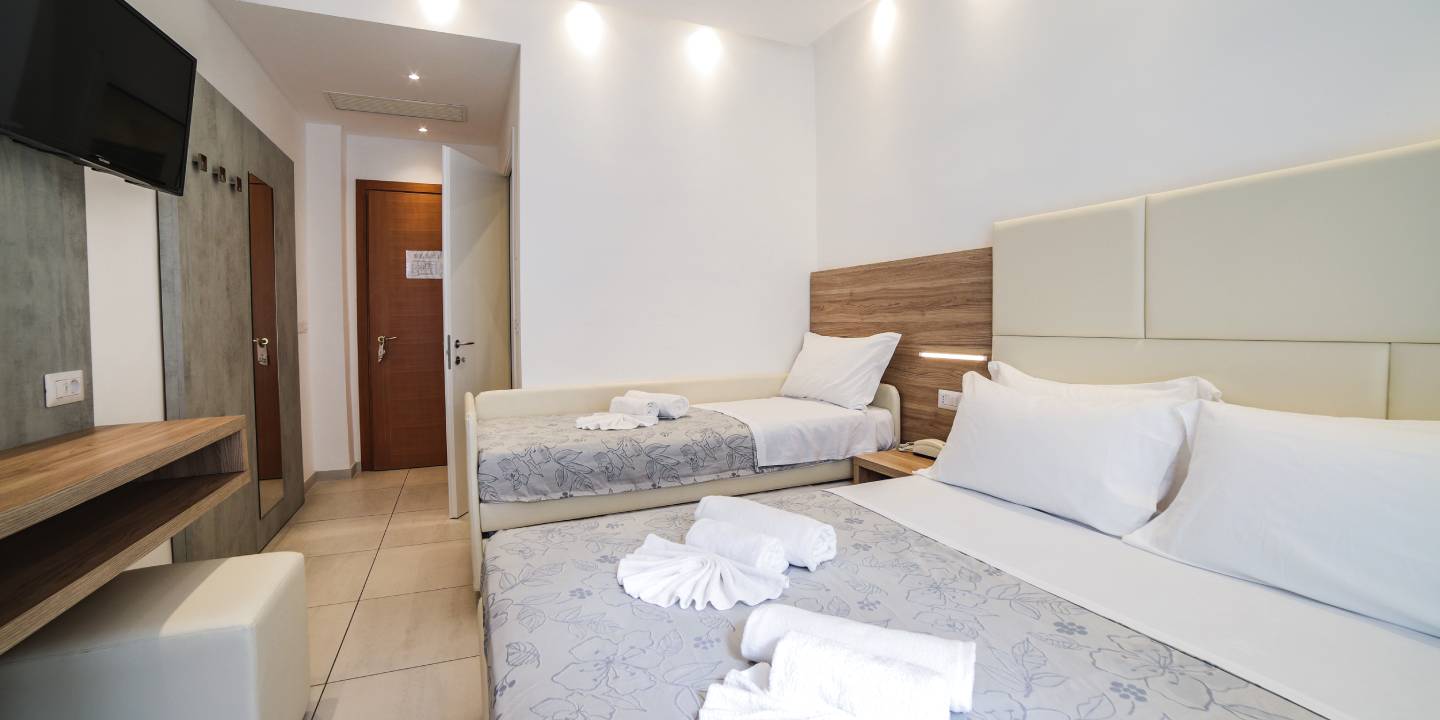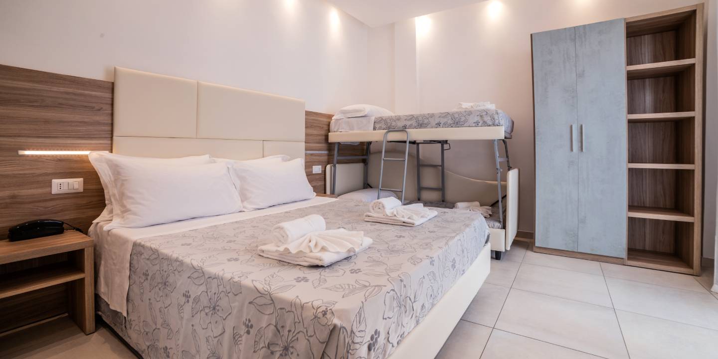 Camere doppie che possono trasformarsi in triple con letto singolo o quadruple con letto a castello, facendone un luogo perfetto per il riposo delle famiglie con bambini anche grandi.
